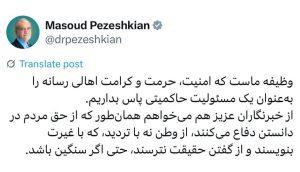 دکتر مسعود پزشکیان، رئیسجمهور، در پیامی به مناسبت روز خبرنگار تأکید کرد: